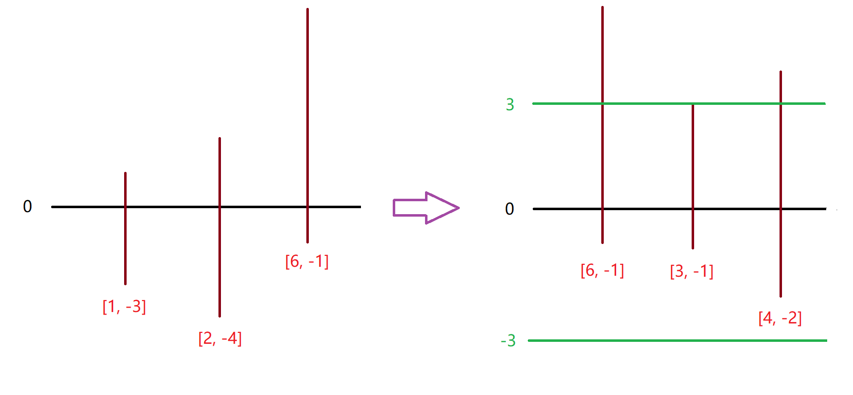 因为有竹竿 $[3, -1]$ ,所以 $C \leq 3$,那么对于所有竹竿,绝对值大于 $3$ 的部分是没用的。